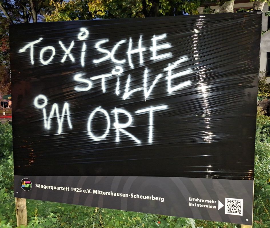 Um der Intention des Projekts noch einmal einen besonderen Nachdruck zu verleihen, wurden an diesem Tag alle Fotos mit schwarzer, blickdichter Folie verhüllt – sichtbar blieb nur der Vereinsname. So sollte deutlich werden, was unserer Gemeinschaft fehlen würde, wenn es die vielen ehrenamtlich geführten Vereine und Institutionen nicht mehr gäbe.