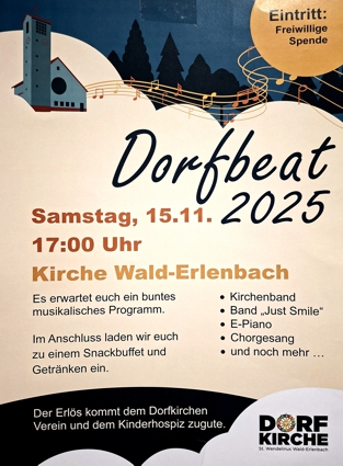 Dorfbeat, eine örtliche Initiative in Wald-Erlenbach zur Belebung des Dorflebens und der Kirchengemeinschaft, veranstaltet den DORFBEAT in der Kirche Sankt Wendelinus mit einem sehr breiten und abwechslungsreichen musikalischen Programm.